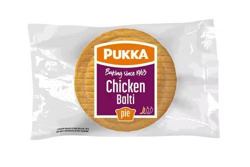 A ready baked pie comprising of rich balti sauce (vegetables herbs & spices cooked in oil) with pieces of chicken in a light puff pastry case